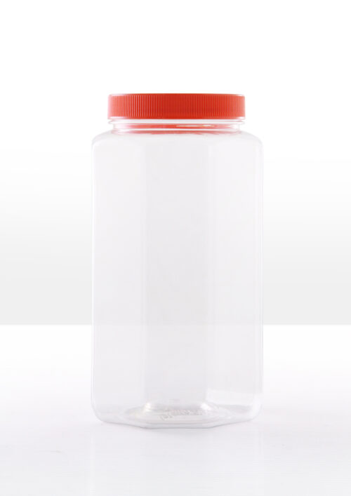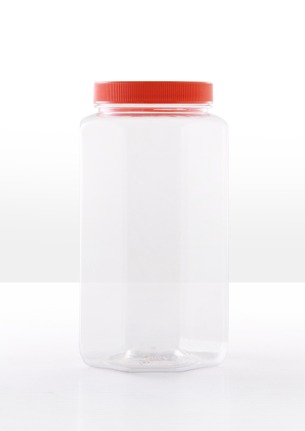 These are made of food-grade plastics, with clear octagonal prism bodies and red lids.