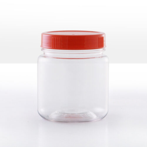The smallest of the jar products, these are made of food-grade plastics, with clear cylindrical bodies, curved shoulders and red lids.