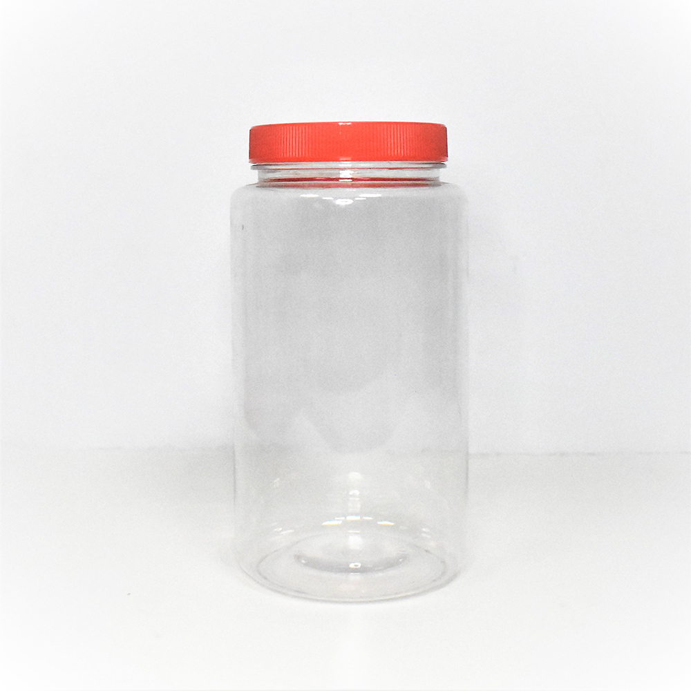 These are made of food-grade plastics, with clear cylindrical bodies, curved shoulders and red lids.